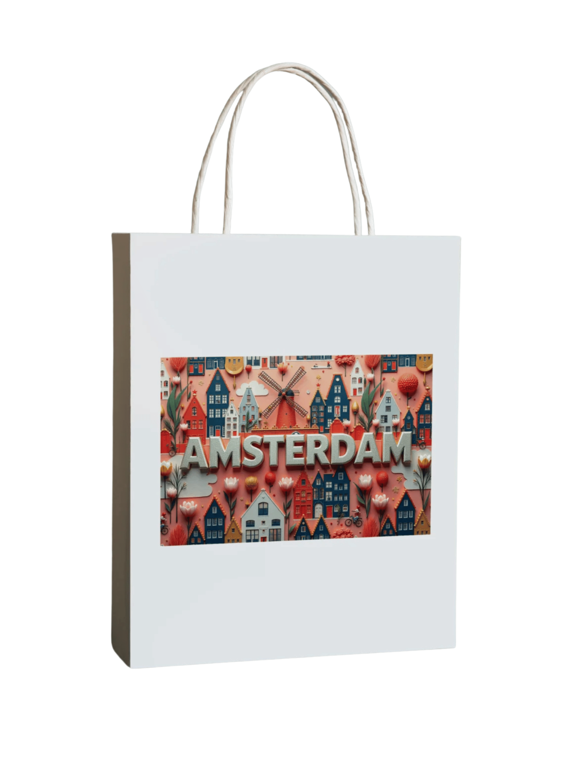 A white paper bag with rope handles, featuring a colorful design of Amsterdam’s iconic elements like windmills, tulips, and canal houses, with “AMSTERDAM” prominently displayed in bold letters. Ideal as a keepsake or gift bag from a visit to the city.