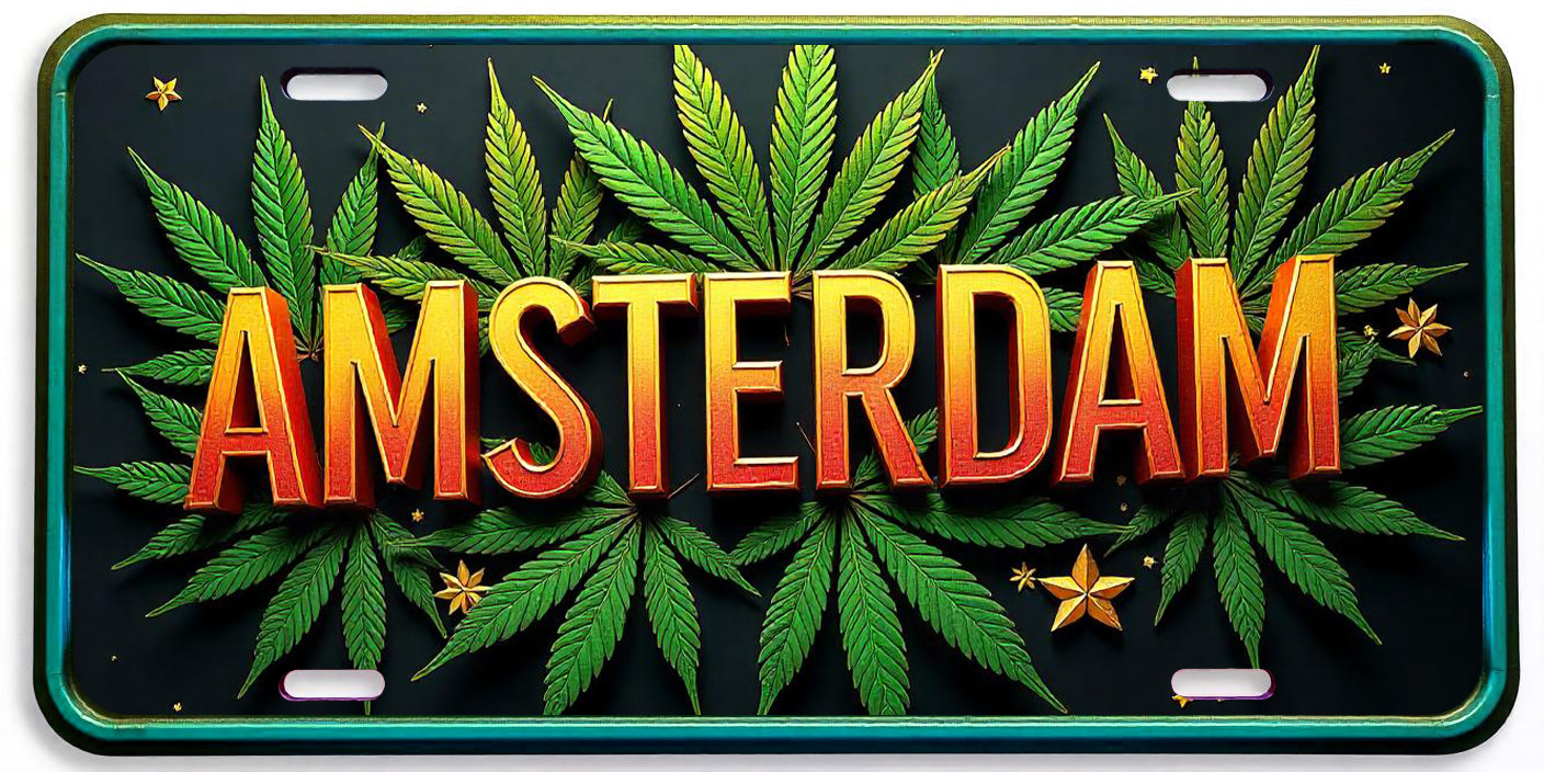 A rectangular plate with a dark background, featuring the word “AMSTERDAM” in bold, gradient orange and red 3D letters. The text is surrounded by stylized green cannabis leaves, with small golden stars scattered around, emphasizing the city’s association with cannabis culture.