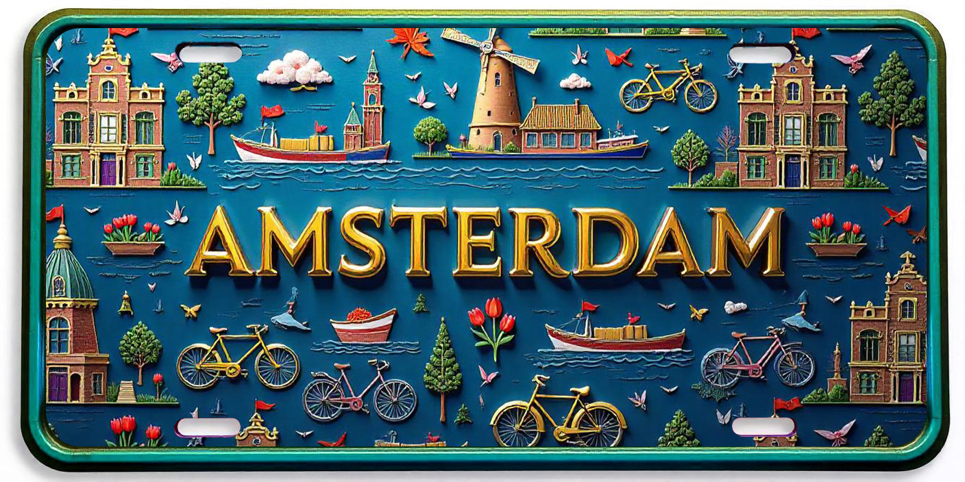 Celebrate Amsterdam’s iconic charm with this detailed license plate. Featuring a vibrant blue background with canal houses, bicycles, boats, a windmill, and tulips, this plate captures the essence of the city’s picturesque landscapes. The bold “Amsterdam” lettering in gold stands out beautifully. Perfect for car enthusiasts or collectors, this durable, weather-resistant plate adds a touch of Dutch culture to any vehicle.
